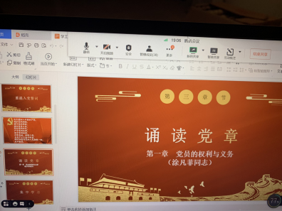 会议伊始,陈金枝同志带领全体党员同志重温入党誓词,感受铿锵誓言的能量。然后由涂凡菲同志带领我们诵读党章中《党员的权利和义务》部分内容;接着是集中学习部分:刘天峥同志向我们传达了《学习贯彻习近平总书记在中央政治局第三十次集体学习时的讲话精神》,她表示作为高校教师同样要提高政治站位,立足实际对学生开展思想政治教育;罗栎鋆同志向我们传达了《深入学习贯彻习近平总书记在青海省和西藏自治区考察期间的重要讲话精神》,精神中强调要加大对边区的帮扶和支援工作,罗老师结合从就业的角度对学生党员未来的发展进行了指导,表示当代的青年大学生要有不怕吃苦的精神,要学会将自己的职业理想与祖国的发展需要结合起来;李玮珏同志向我们传达了《认真学习贯彻省委书记应勇同志和市委副书记、市长程用文同志在全省全市在“两优一先”表彰大会上的讲话精神》,她带我们认真剖析了该讲话精神,并结合自己的工作经历和心得体会谈到了作为一名高校教师党员应该具备的心态和精神,此外,李玮珏同志还分享了她在自己所在的封控小区参与志愿服务的经历和感受。