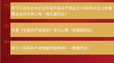 在集中学习环节,周孔强同志围绕《习近平总书记在庆祝中国共产党成立100周年大会上的重要讲话》分享学习心得,表示自己会忆往思来,在工作和实践中涵养自己对党的忠诚;李园园同志向大家分享了自己学习《中国共产党简史》心得体会,她表示在学习的过程中才深刻体会到我们党百年奋斗之路的艰难,才更加能体会到当下幸福生活的不易;黄理同志为我们传达了《中国共产党党徽党旗》条例的相关知识。