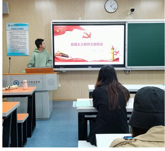 英教2003班班会中,同学们还一起学习爱国主义,了解民族精神,在“苟利国家生死以,岂因祸福避趋之”的英勇里歌咏;在“杀气三时作阵云,寒声一夜传刁斗,相看白刃血纷纷,死节从来岂顾勋”的不屈里发扬。商英1907班班长告诉同学们,如何做一名真正的爱国主义大学生: