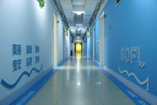 外语学院在学生宿舍一楼建设了一条独具特色的文化长廊,以外语学院的代表色——蓝白——为基调,窗户上布置着花花草草,两侧墙上还贴着一些贴心鼓励的标语。