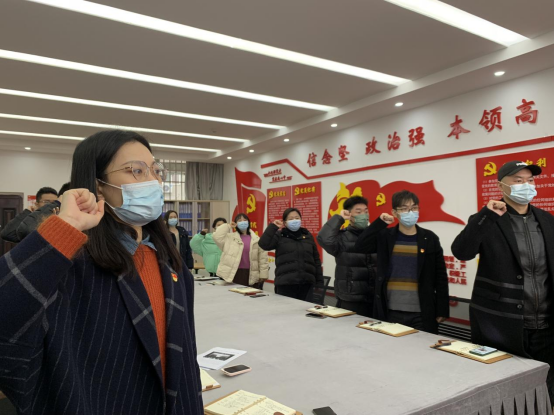 在向组织委员李园园同志缴纳完党费后,支部成员全体起立面向党旗宣誓。接着,支部全体成员一同学习了党章《党的基层组织》部分内容,深刻明晰党的基层组织的各项制度和要求。