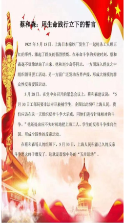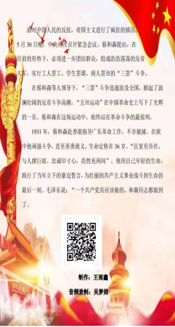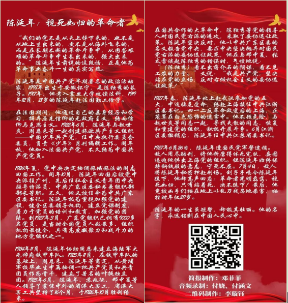 四月,外语学院党总支组织52名优秀团员代表开展了“党史故事忆峥嵘,最美声音代传承”主题活动,学院五名党员老师通过引导学生细读党史,收集和朗诵红色“党史”故事,让同学们用情感真挚、铿锵有力的声音“传”中国共产党的初心使命、“颂”革命英雄的壮烈事迹。通过本次学习和实践活动,大家对党的光辉历史有了更深入的理解,同学们用真挚地情感传颂那些不能忘却地峥嵘岁月和英雄故事,让学史增信的意识“强”起来了,在“润物细无声”中活化了教育效果,让学史崇德的观念“树”起来了,大家进一步知史爱党、知史爱国。下面让我们一起聆听同学们讲述红色党史故事,感受百年风华,弘扬红船精神,从百年党史中汲取前行力量吧!