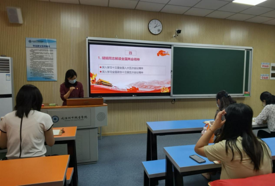 胡娟同志解读十三届全国人大五次会议精神,围绕“三个突出”,一是突出坚守“政治”本色,在凝聚思想共识上“扣紧扣子”。二是突出增强“担当”底色,在依法履职尽责上“担好担子”。三是突出提振“精神”气色,在落实重点任务上“钉牢钉子”。