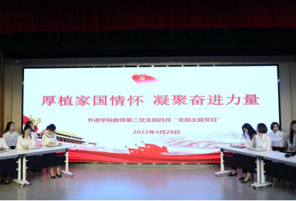 2022年4月28日下午,外语学院教师第二党支部四月支部主题党日活动“厚植家国情怀 凝聚奋进力量”在教学楼2-4-402教室展开。本次活动是我校组织“创意主题党日我来开”现场观摩和学习系列交流的活动之一。正值学校副校长杨爱民调研外语学院,中途亲临现场指导,组织部李春梅老师前来观摩组织、以及来自学校各个院系的党员教师代表也出席参与了此次主题活动。活动由教师第二党支部书记胡冲主持。