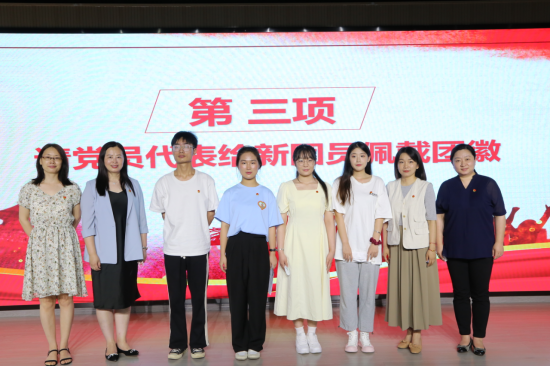 会议上,大家首先唱响国歌、团歌。来自商英2001班吕孝盼,跨境2101班潘丽琴,邮轮2002班杨涵宇和英教2003班张婧四名新入团成员上台宣誓,同时四位党员代表为他们佩戴了团徽。