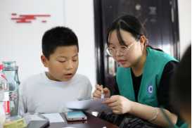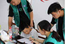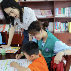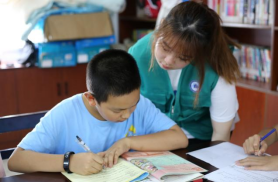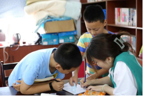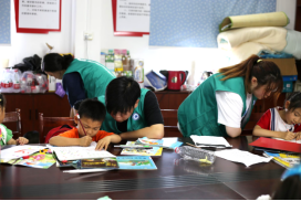 各个年级的孩子被队员们安排在相应的位置上,秩序井然。孩子们都自觉遵守“小课堂”的纪律,安安静静地完成自己的作业,遇到不懂的问题,两位带队老师和队员们都很耐心帮助他们解决,现场学习氛围很是浓厚。