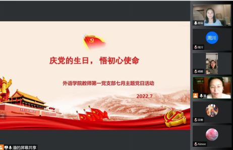 2022年7月28日13:00,外语学院教师第一党支部全体党员教师在潘文霞书记的带领下,线上举行了本月主题党日活动,会议由潘文霞同志主持。