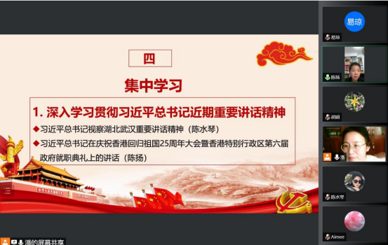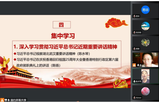 接着,进入集中学习阶段。陈水琴同志带领大家学习了习近平总书记视察湖北武汉重要讲话精神。习近平总书记指出,随着我国发展壮大,突破“卡脖子”关键核心技术刻不容缓,必须坚持问题导向,踔厉奋发、奋起直追,加快实现科技自立自强。同时强调我们实施动态清零政策,是党中央从党的性质宗旨出发、从我国国情出发确定的,宁可暂时影响一点经济发展,也不能让人民群众生命安全和身体健康受到伤害,尤其是要保护好老人、孩子。陈杨同志就习近平总书记在庆祝香港回归祖国25周年大会暨香港特别行政区第六届政府就职典礼上的讲话。会议强调香港正处在从由乱到治走向由治及兴的新阶段,未来5年是香港开创新局面、实现新飞跃的关键期。会议提出,完善治理体系、提高治理能力、增强治理效能,是把香港特别行政区建设好、发展好的迫切需要。希望全体香港同胞大力弘扬以爱国爱港为核心、同“一国两制”方针相适应的主流价值观,继续发扬包容共济、求同存异、自强不息、善拼敢赢的优良传统,共同创造更加美好的生活。