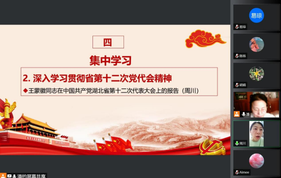 周川同志分享了王蒙微同志在中国共产党湖北省第二十次代表大会上的报告精神。这次党代会,总结了过去五年的工作成绩和宝贵经验,分析了新发展阶段湖北面临的新形势新任务,描绘了今后五年乃至更长一个时期湖北的发展蓝图。我们要以永不懈怠的精神状态和一往无前的奋斗姿态,锐意进取、开拓创新,努力建设全国构建新发展格局先行区,加快“建成支点、走在前列、谱写新篇”,以优异成绩迎接党的二十大胜利召开。