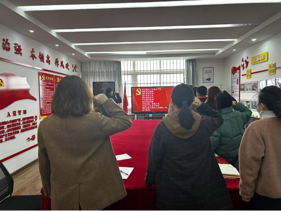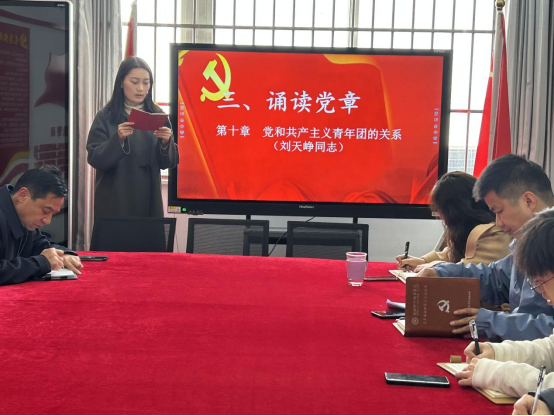 会上,党支部全体党员共同颂唱国歌,缴纳2月党费,在本次会议主持人李娟同志的领读下,重温入党誓词。随后,刘天峥同志领读党章第十章《党和共产主义青年团的关系》,中国共产主义青年团是党的助手和后备军,以党的建设带领和带动团的建设,教育、带领广大青年建设有中国特色社会主义事业。