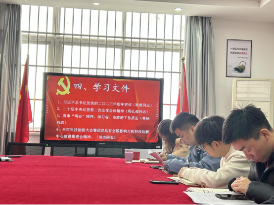 在集中学习环节,耿煜同志带领支部党员学习《习近平总书记发表的二〇二三年新年贺词》。习近平总书记指出,广大青年要厚植家国情怀、涵养进取品格,不负时代,不负华年。作为教师的我们,更应该认清责任使命,不负期望重托,为党育人,为国育才。周孔强同志与党员们共同学习二十届中央纪委第二次全体会议精神。习近平总书记在会上强调,治国必先治党,党兴才能国强,纪律是管党治党的“戒尺”,也是党员、干部约束自身行为的标准和遵循。我们作为一名党员,将始终不忘初心,牢记使命,立足本职工作,以无畏担当走好新征程。林杨同志领学省市“两会”精神,学习省、市政府工作报告。过去的2022年是党和国家历史上极为重要的一年,回顾2022、规划2023。过去一年沉甸甸的成绩,激发了共同创造美好未来的昂扬斗志,听了工作报告,我们备受鼓舞。在田杰同志的领学下,支部党员共同学习了全市科技创新大会暨武汉具有全国影响力的科技创新中心建设推进会精神。武汉积极主动服务国家重大战略,打造新时代的英雄城市,作为培养人才的教育工作的我们,也应当不辱使命、奋勇向前。