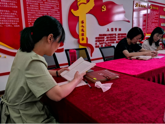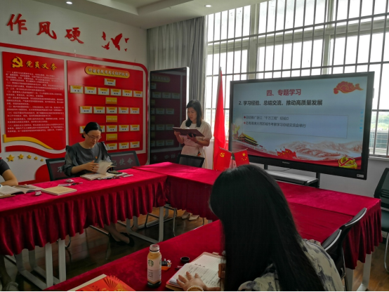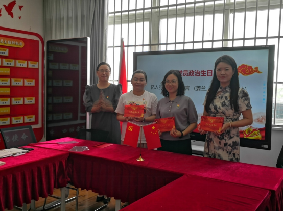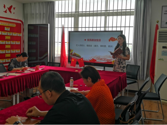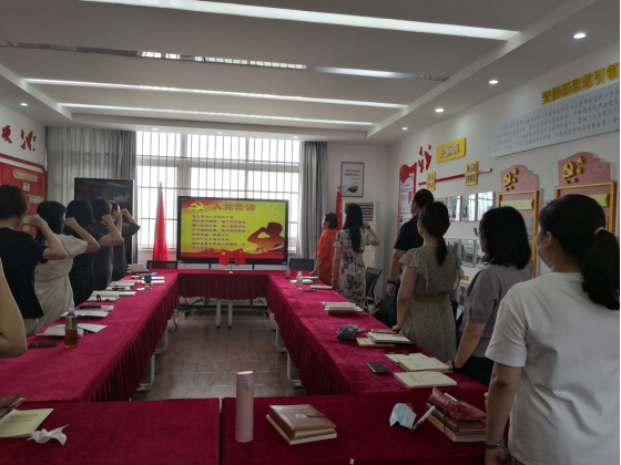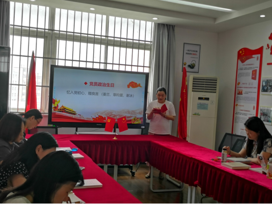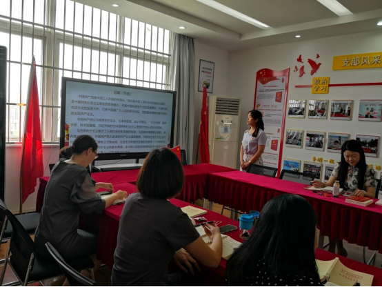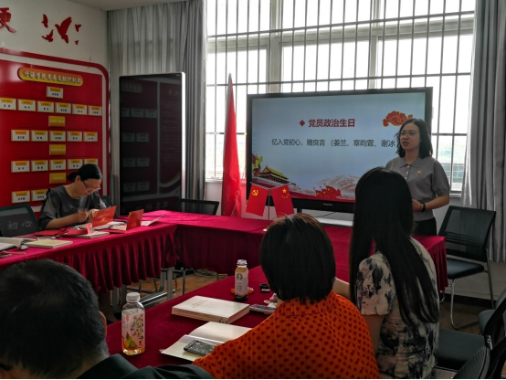 首先,全体党员教师在刘穗老师的带领下重温了入党誓词并缴纳了六月份的党费。本月是姜兰副院长、章昀萱老师和谢冰老师的政治生日,她们满怀热情地忆初心,回顾了入党动机和经历,胡冲书记代表组织向三位老师赠良言、送贺卡。随后,蒋婷老师带领大家集体诵读了党章。