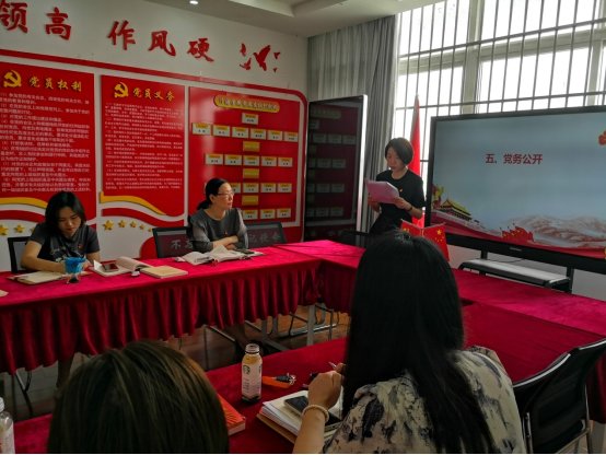 在党务公开环节,纪检委员董瑶老师带领大家学习了《武汉城市职业学院关于开展不担当不作为问题专项治理的工作方案》。董瑶老师号召全体支部党员为完成中心任务而团结奋斗,自省自查能力本领、担当作为、工作作风等方面的问题,营造主动下沉一步、积极上前一步的干事氛围,为加快打造新时代英雄城市和推动学校提档升级提供作风保障。随后,胡冲书记带领大家学习了学校刚刚下发的《关于端午节期间严明有关纪律要求的通知》,提醒和警示党员教师们时刻把纪律和规矩放在前面,提高政治站位,筑牢思想防线,共同营造祥和节俭、风清气正的节日氛围。