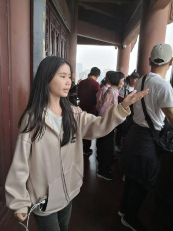 经过一个小时左右的车程,大家到达了黄鹤楼南门。示范讲解和实践活动开始了,黄鹤楼景区安排了两位21级学姐做景区接待和讲解服务,学姐们在学校和黄鹤楼现代学徒制共同培养下,已经是黄鹤楼景区的优秀专职讲解员了。