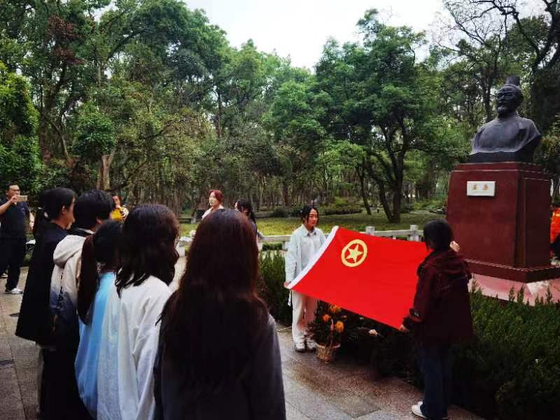 接下来前往行吟阁开展团建活动。在屈原的雕像下,同学们共同重温入团誓词,共唱团歌。旅游英语2301班班长向往同学讲述屈原的故事,旅游英语教研室主任胡冲老师给同学们讲团课,外语学院副院长张俊老师发表讲话,勉励同学们从这次活动中有所发现,有所成长。