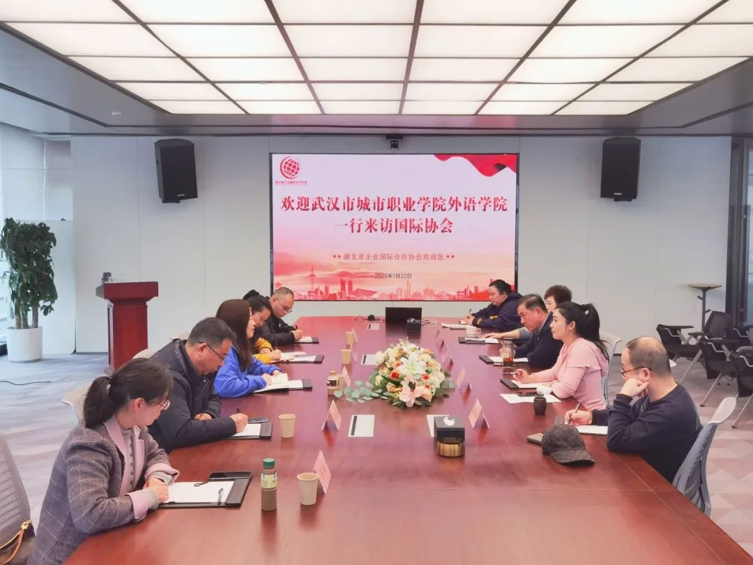 2025年1月22日下午,武汉城市职业学院外语学院(国际教育学院)一行访问了湖北省企业国际合作协会,旨在深入贯彻党的二十大精神,落实国家“教随产出、随企出海”的战略部署,推动职业教育高水平对外开放发展,加强校企联动,促进国际教育项目合作,共同推进技能人才高质量联合培养工作。