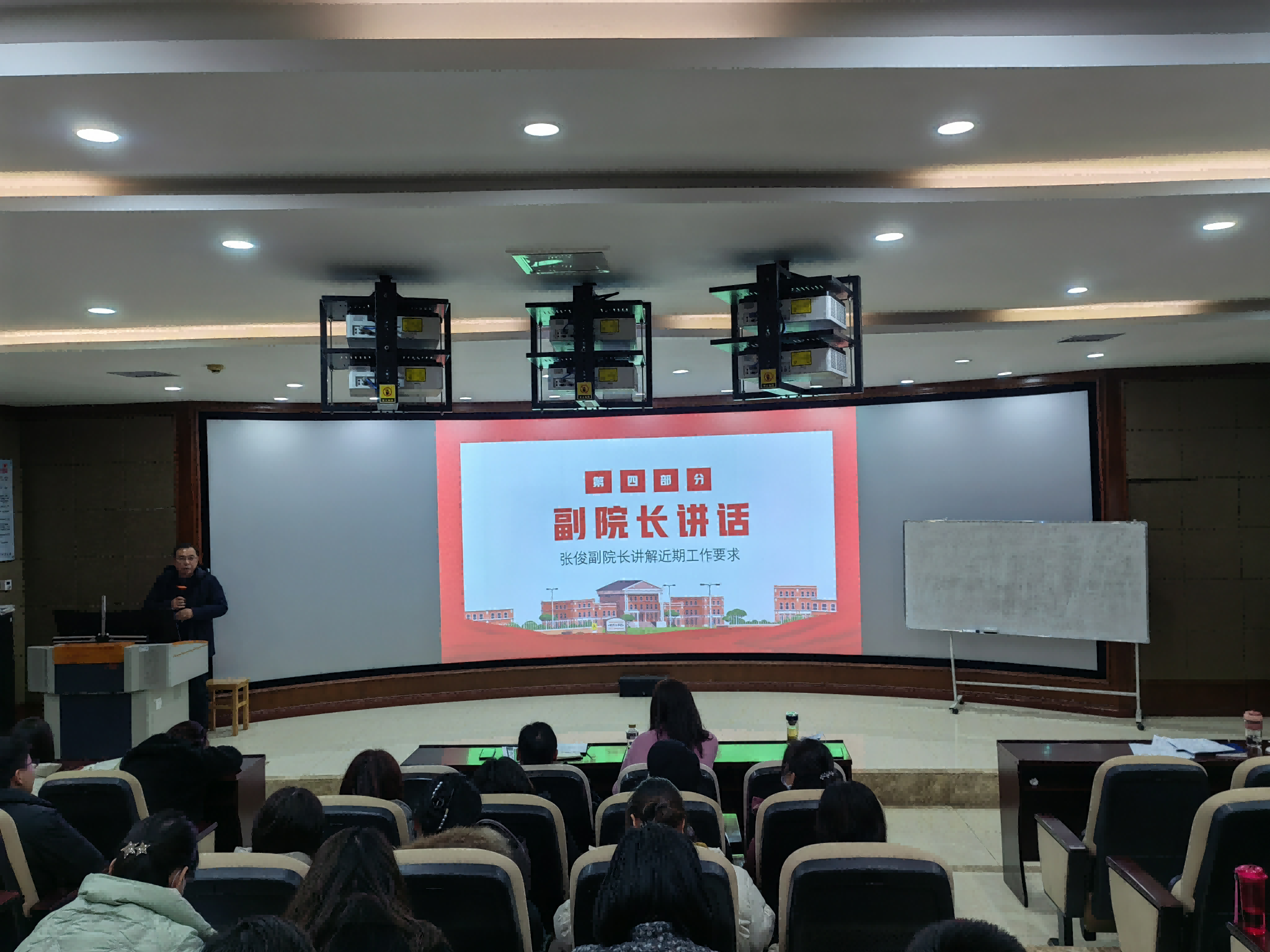 接着,学院张俊副院长讲话。张院长主要围绕学生顶岗实习工作以及学院实训室建设工作发言,重点强调了学生顶岗实习期间的安全问题,指出实习指导老师应加强对学生的安全教育,提高学生的安全意识和自我保护能力,同时定期了解学生在实习单位的情况,及时帮助解决学生在实习中遇到的问题。随后,学院党总支刘求明书记上台讲话。刘书记表示2024年是学院快速发展的一年,同时也是成绩满满的一年,他带领我们重点回顾了学院的党建工作和安全工作,对学院各个支部及个人在党建工作中取得的成绩给予表扬;同时,刘书记强调,2025年学院将聚力党建、安全及专业三项工作的品牌建设,对后续工作也提出了要求:2025年,我们要认清形势、提高认识、谋定而后动;要砥砺奋进、迎难而上、思深而后为。