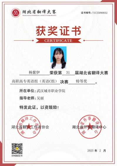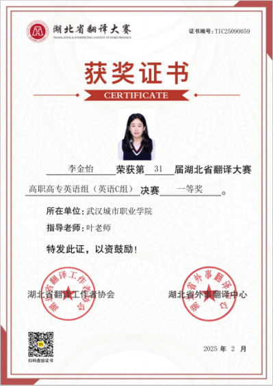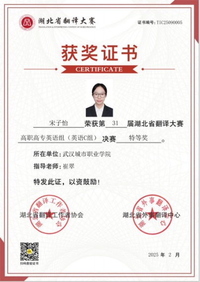 在2025年3月揭晓的第31届湖北省翻译大赛决赛成绩中,武汉城市职业学院交出了一份亮眼答卷:近300名学生参赛,80人获奖,特等奖2项,一等奖11项,二等奖27项。获奖总数与等级均创历史新高。