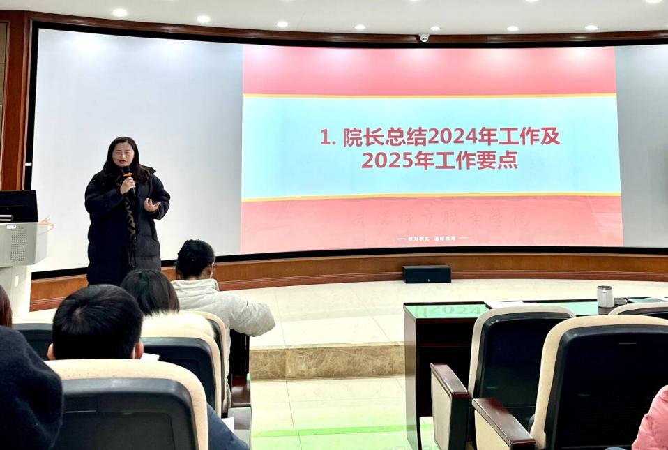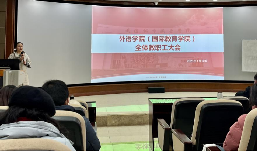 2025 年 1 月 10 日上午,外语学院(国际教育学院)全体教职工大会在 2-4-403 邮轮实训室顺利举行。本次大会全面总结回顾了2024 年度学院工作情况,学院领导班子及全体教职工参加本次会议。