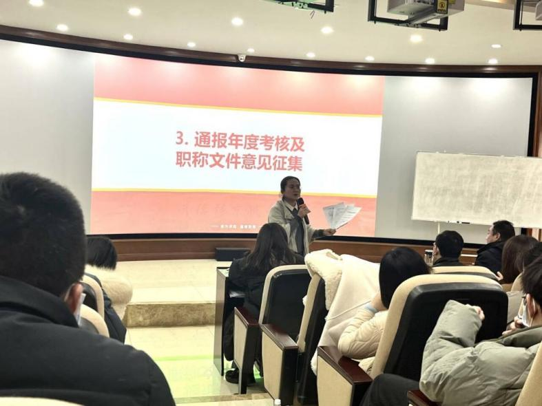 接着,董云燕主任在大会上对本年度考核工作安排及学校职称文件意见征集工作等进行通告。会上详细解读了职称评审的新政策、新标准,鼓励教职工积极参与意见征集,为完善职称评审制度贡献智慧。