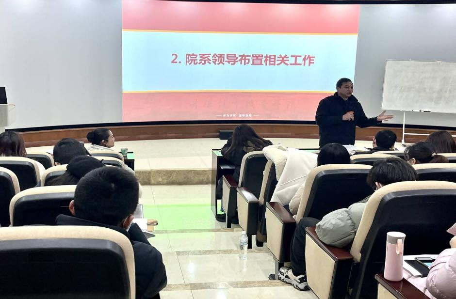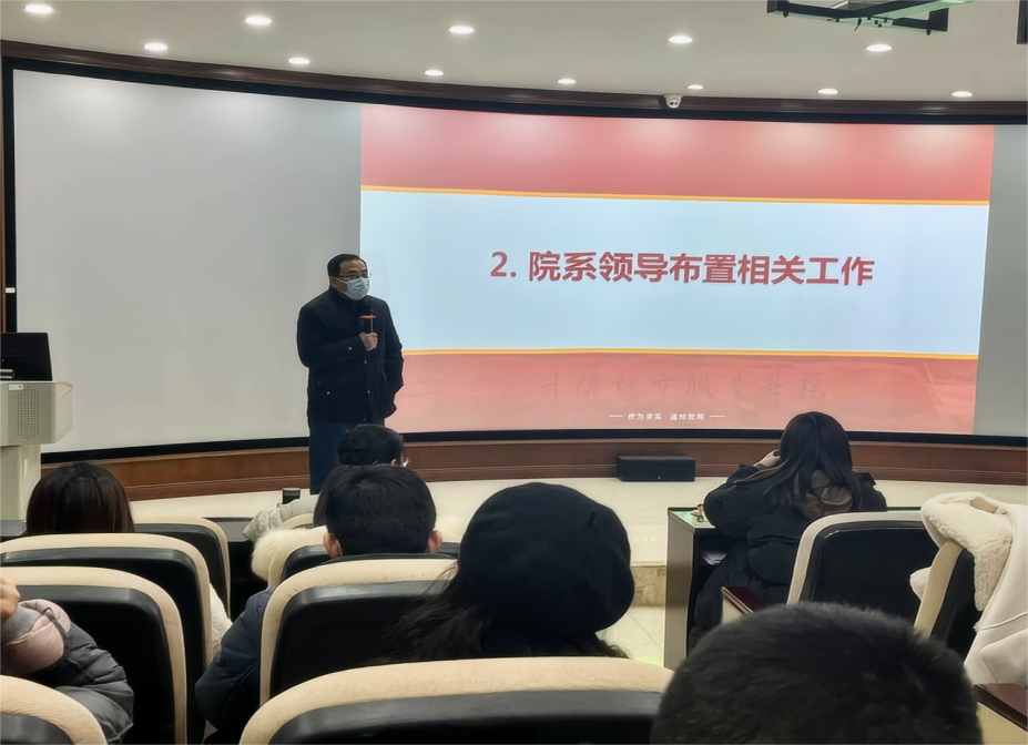 吴院长总结后,学院书记和副院长等分别就分管工作进行详细部署。张俊副院长就学生实习方面提出具体要求:关心学生实习工作,保持与学生的密切联系,及时关注学生思想动态和行为动向;刘求明书记强调教师加强自身以及对学生的思想政治教育;董瑶主任对全体教职工提出寒假期间加强学习的建议,强调尤其要加强职业教育方面的文件学习,鼓励教师提升科研能力。各领导及老师的发言明确了新学期的工作重点和方向。