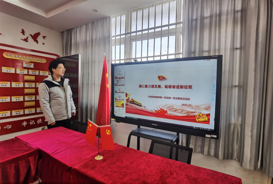 2025 年 1 月 10 日,外语学院教师第一党支部于 2-1-401 教育党建工作室开展了主题为“聚力启新程,奋进谱新篇”的一月主题党日活动。此次活动在组织委员刘志明同志的主持下顺利进行,全体党员同志佩戴党徽,准时参会。