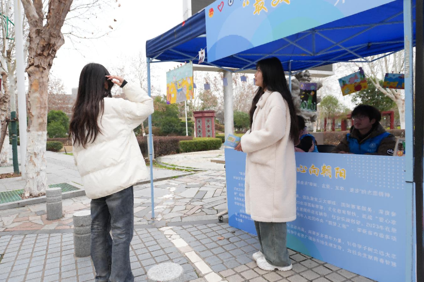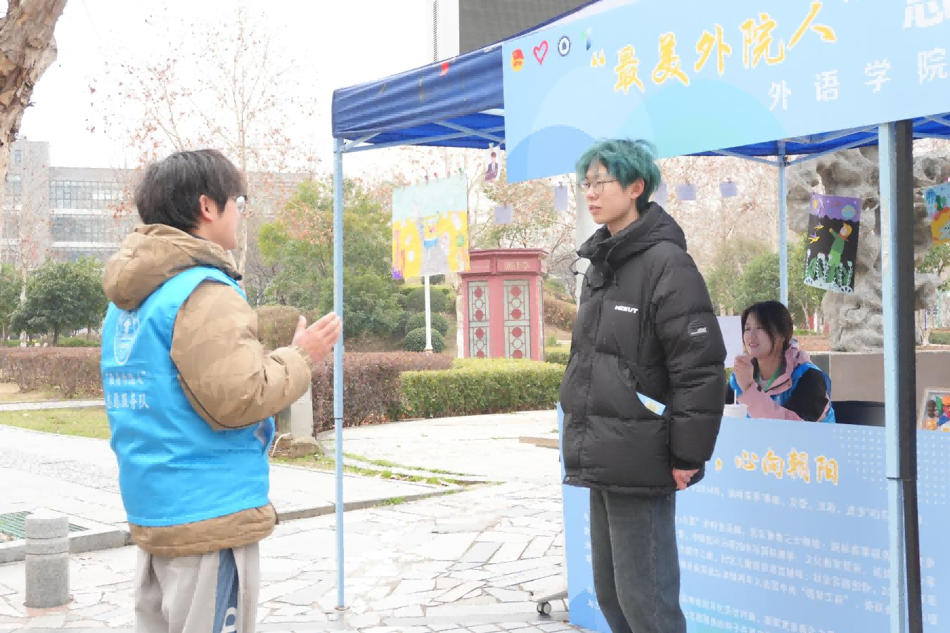 活动一开始,便迅速点燃了现场气氛。路过的老师、同学都积极参与其中,围观的人们眉开眼笑,被精彩的活动深深吸引。其中,互动游戏“你画我猜”最受欢迎,志愿者们准备了丰富多样的词语卡片,内容涵盖了日常生活、成语俗语、名人名言等多个领域,有的同学肢体语言了得,将词语的关键特征惟妙惟肖的展现出来,让搭档轻松猜出答案;有的则略显紧张,表演的虽不太形象,但搭档凭借默契也能心领神会。大家时而为成功猜出词语欢呼雀跃,时而为滑稽的动作而忍俊不禁,现场欢声笑语不断。
