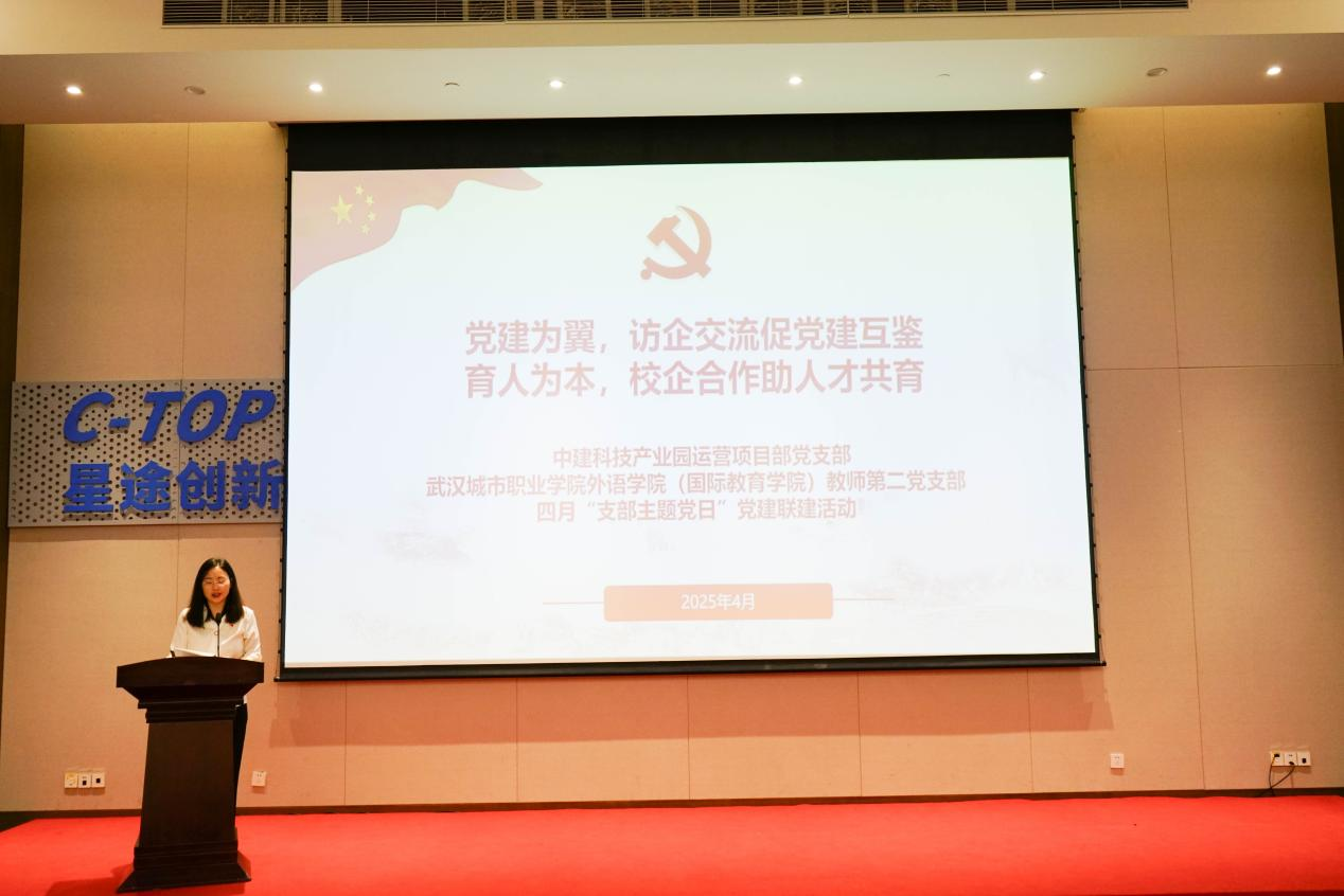 中建科技产业园运营项目部党支部书记胡娇和中国建筑科技馆馆长张祖礼对大家的到来表示热烈的欢迎。武汉城市职业学院马克思主义学院书记杜娟、组织部副部长胡华平、外语学院(国际教育学院)吴丽院长、刘求明书记、张俊副院长出席了此次活动。