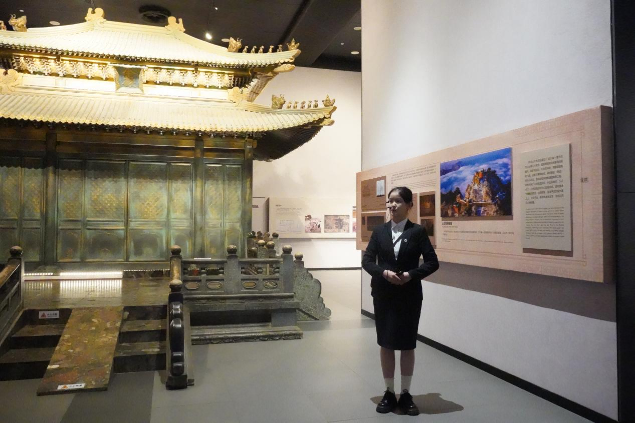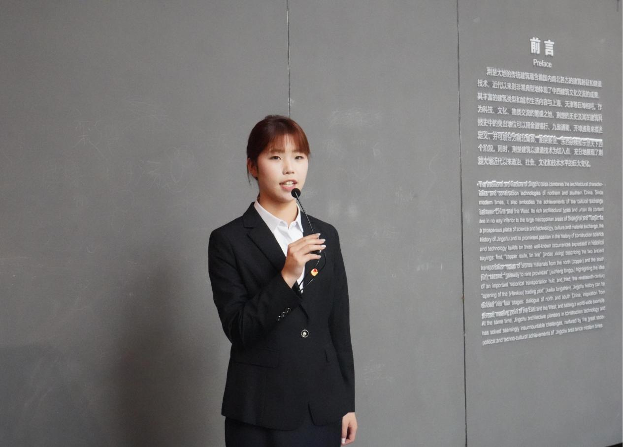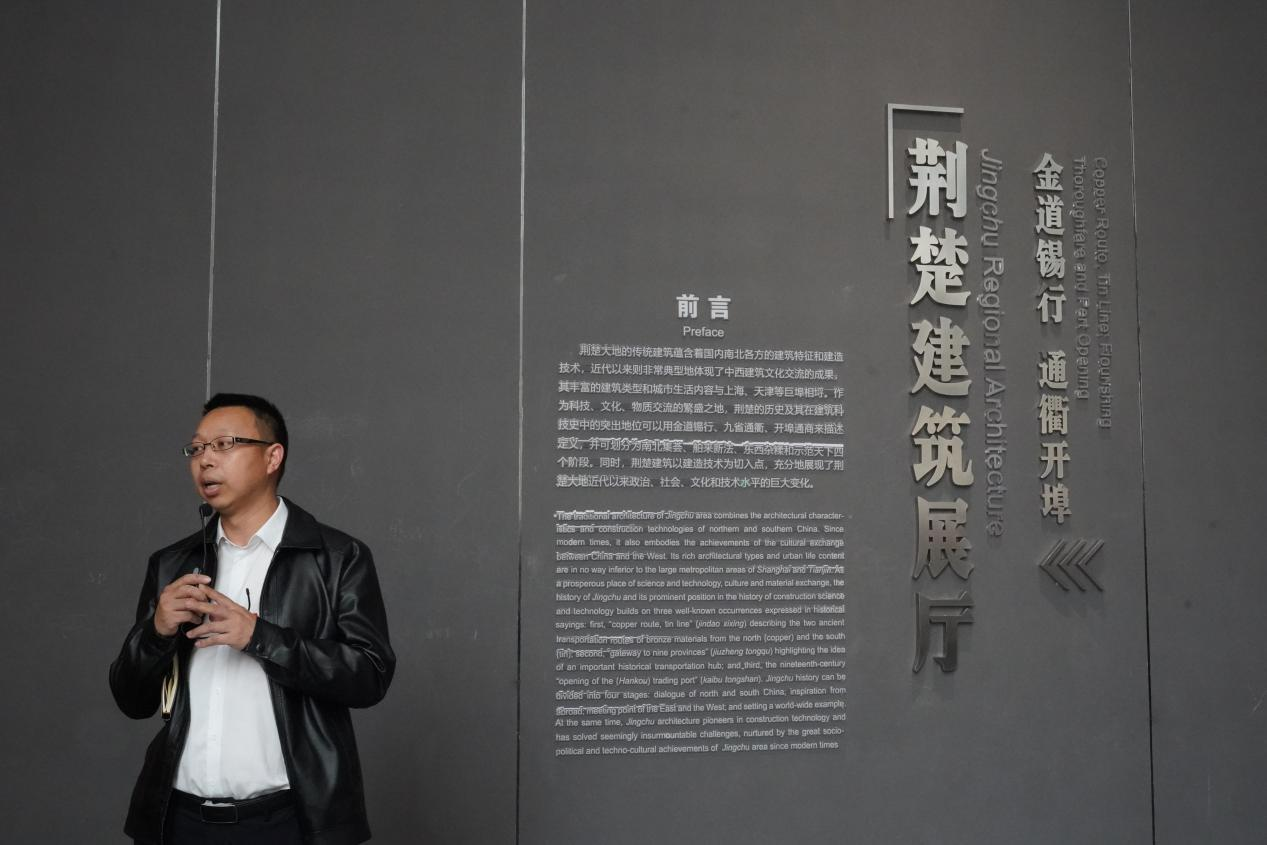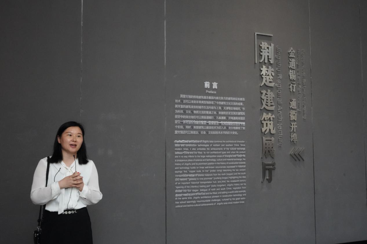 最后,在“荆楚筑魂,师传匠心”环节。全体党团员走进场馆,倾听企业导师和外院学生共同讲解荆楚展厅。企业导师代表乐晓姚以荆楚建筑历史脉络为引,结合榫卯技艺、飞檐斗拱等特色元素,讲解荆楚建筑建造智慧,挖掘工匠精神。外院学生田梅美、张水萍、韩易等运用双语讲解,从国际传播视角解读荆楚建筑的美学价值与文化符号,选取代表性建筑武当山金顶、清代黄鹤楼,讲述其背后承载的荆风楚韵,展现文化自信与爱国情怀。党员教师代表陈晶、团员学生代表王义婷等结合党团精神,围绕“匠心精神与新时代党员使命”主题进行了心得分享,将荆楚建筑的工匠精神与党员、团员责任担当深度融合。