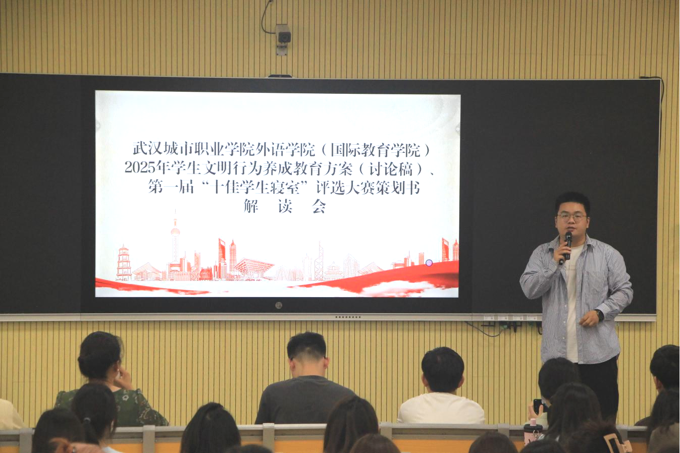 紧接着,辅导员曹昆老师开展了行为规范专题讲解。他着重强调安全工作不容有丝毫懈怠,并围绕外语学院(国际教育学院)2025 年学生文明行为养成教育方案以及“十佳寝室评选”事宜,进行了详尽阐述。他希望同学们严格规范自身行为,牢记“十要十不要”准则。同时他向各班长提出要求,要以主题班会为契机,组织同学们深入学习“五讲”“六要”“十禁止”等文明行为养成教育内容。通过这些举措,学生将深刻了解学校规章制度,明确日常行为规范要求,确保文明行为养成教育活动能够覆盖全体学生,为学校全力冲刺职业本科大学目标奠定坚实基础。