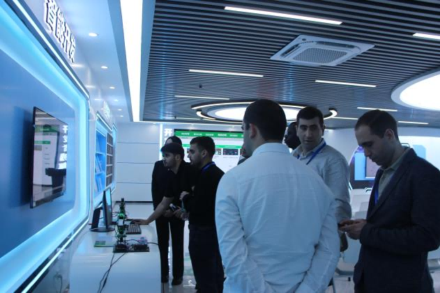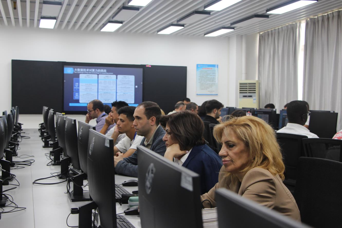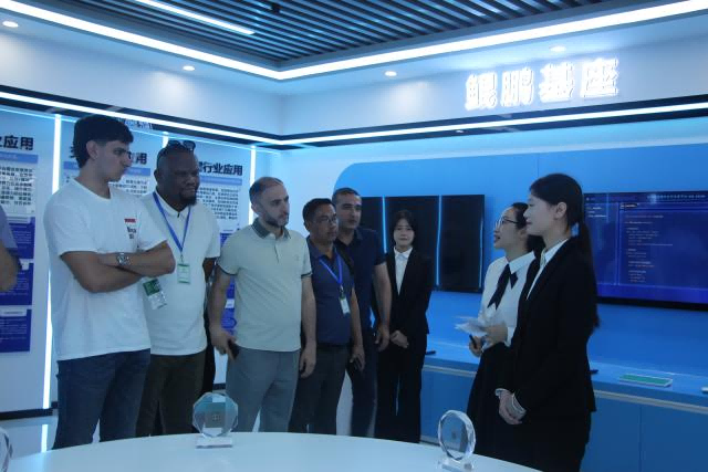 讲座结束后,外国学员们走进了计信学院和华为企业共建的鲲鹏产业学院,近距离参观了算力中心、鲲鹏920处理器及智能计算开发套件等尖端硬件设施,对学院的深厚底蕴、行业应用及卓越成就有了直观而深刻的认识,现场互动频繁,气氛热烈。