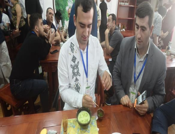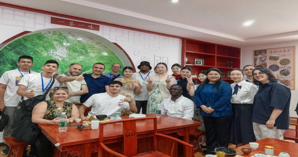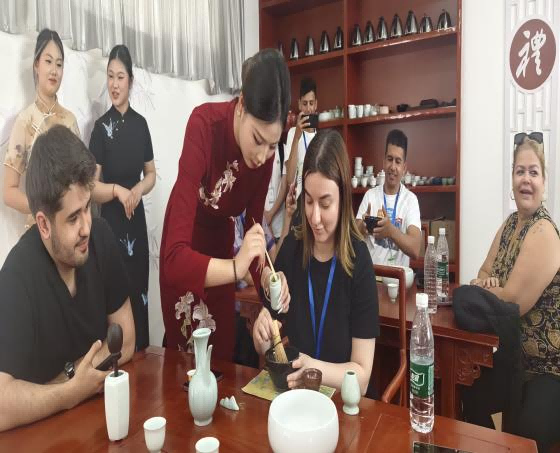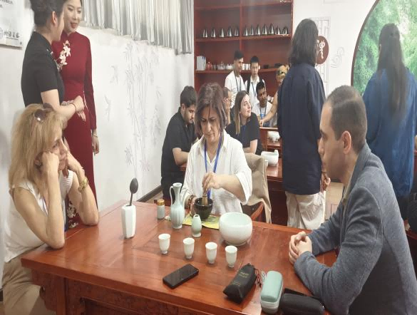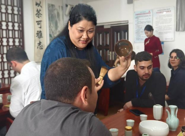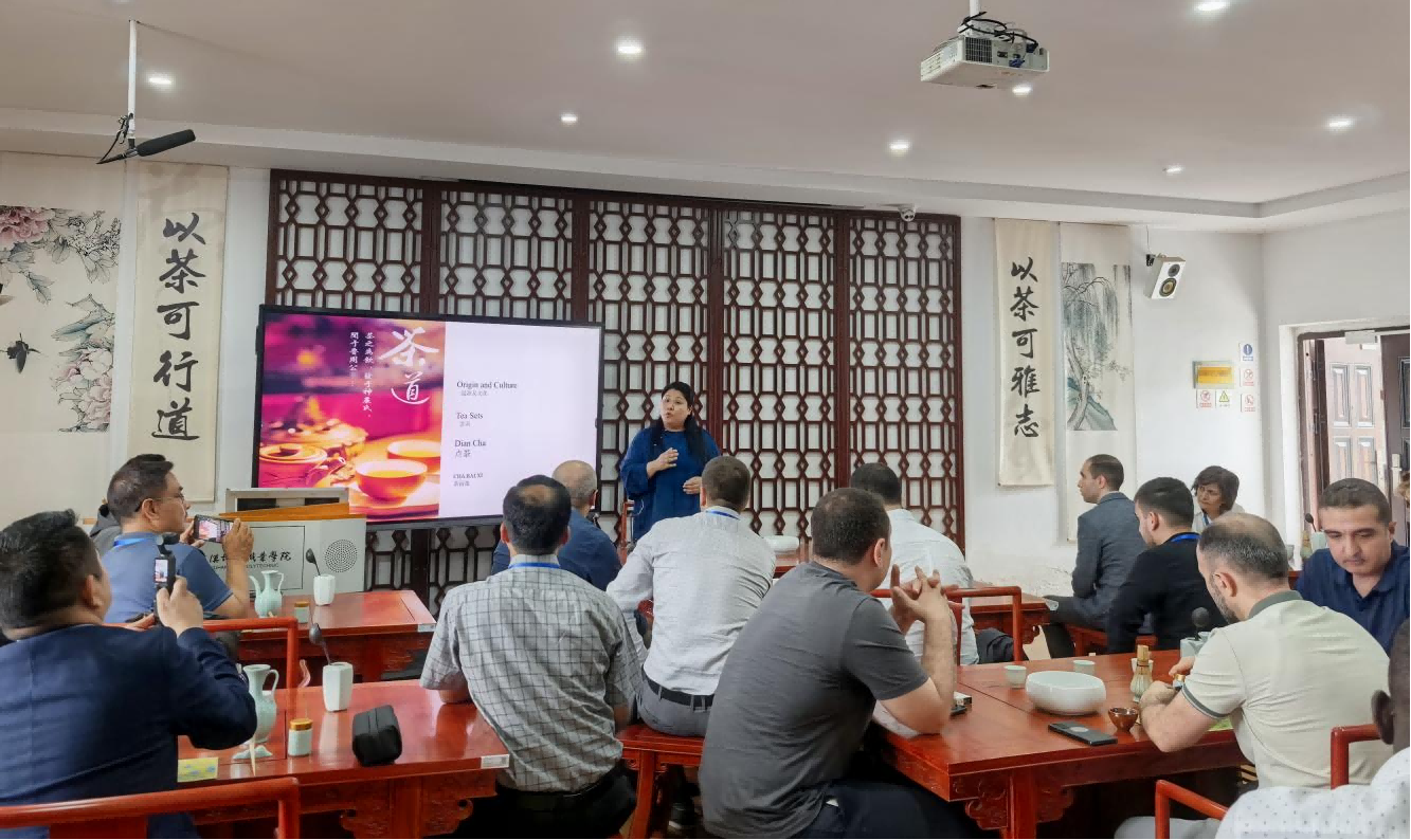 计算机与电子信息工程学院的参观学习结束后,学员们来到了外语学院茶艺室,沉浸式体验中国茶文化。