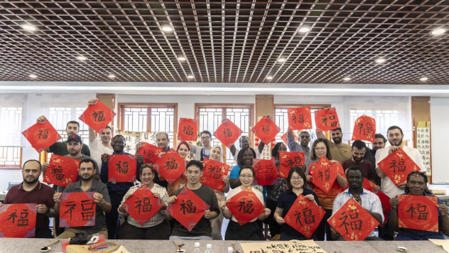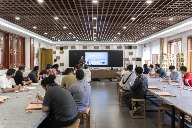 学员们首先来到初等教育学院国学馆,聆听了一堂书法课。初教学院教师丁力以汉字为切入点,为学员们讲解了汉字起源、毛笔使用技巧、墨色变化以及章法布局等知识。他强调,书法不仅是一种艺术形式,更是中华文化的核心精髓之一,集中体现了中国传统哲学精神和艺术审美。在丁力老师的指导下,学员们拿起毛笔,学习书写横、竖、撇、捺、点等基本笔画,最终成功在宣纸上写下“福”字,成就感满满。
