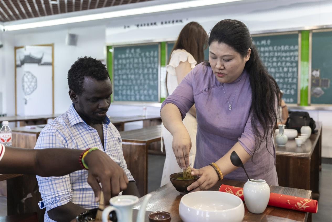 随后,学员们前往外语学院体验中国传统茶文化。外语学院国际邮轮乘务管理专业负责人、高级茶艺师杨林老师为学员们介绍了茶文化的起源与发展,并以宋代点茶为例,详细讲解了其历史与文化背景。接着,杨林老师亲身示范宋代点茶技艺,从茶器选择到茶叶处理,从操作细节到技巧把握,每一个环节都严谨认真,将宋代点茶的精妙之处展现得淋漓尽致。学员们全神贯注地聆听,不时发出赞叹。在亲身体验环节,他们按照杨林老师的指导,在茶汤上作画写字,点出香茗,感受着中国传统茶文化的独特魅力。