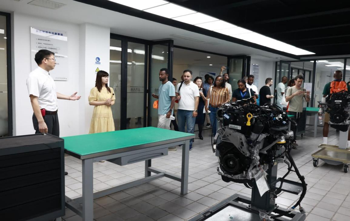 外国学员首先来到学院实训基地“匠之家”,聆听汽车技术与服务学院专业负责人赵聪老师的课程。赵聪老师介绍,学校积极开展国际合作,为多国提供援外技能培训,连续两年入选中国高职院校国际影响力50强,2023年还获评多项荣誉。学院8个专业中,汽车智能技术专业是核心,且与德国北黑森应用技术大学开展中德合作班,还和奔驰、比亚迪等多家企业合作开展订单班培养模式,精准对接企业用人需求。