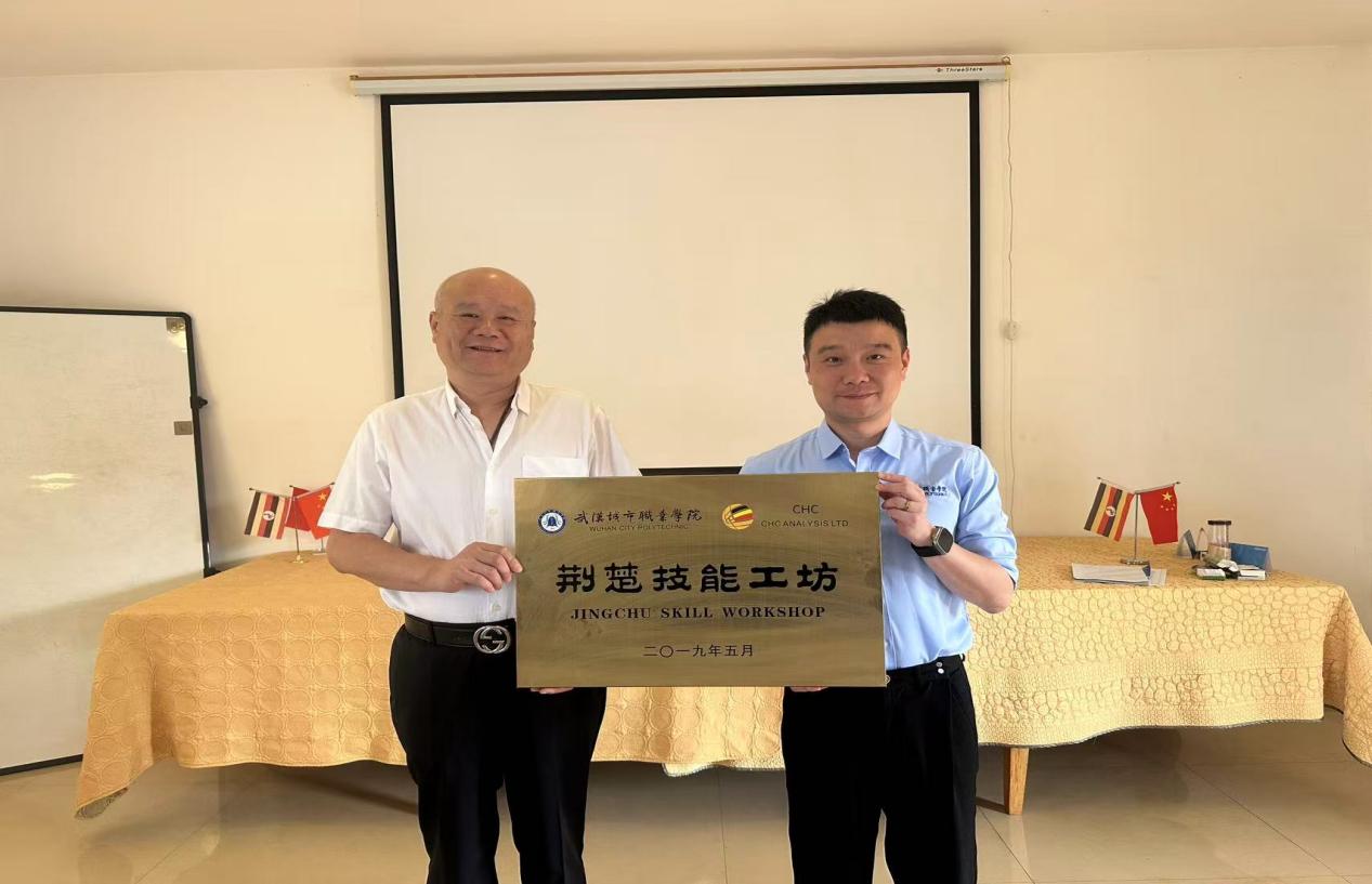 开班仪式在雄浑的中乌两国国歌声中启幕。五星红旗与黑黄红三色旗冉冉升起。仪式后乌干达华测岩矿工程有限公司周泉董事长与我校援乌教师团队团长魏来共同完成了“荆楚技能工坊”挂牌。