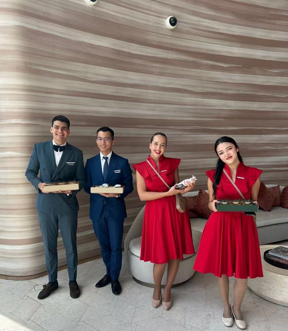国际邮轮乘务专业2018级毕业生李超(左二),现就职于卓美亚港湾酒店,从阿联酋迪拜送来祝福:“愿伟大祖国繁荣昌盛、山河锦绣;愿母校桃李芬芳、弦歌永续!花好月圆,家国同辉!”