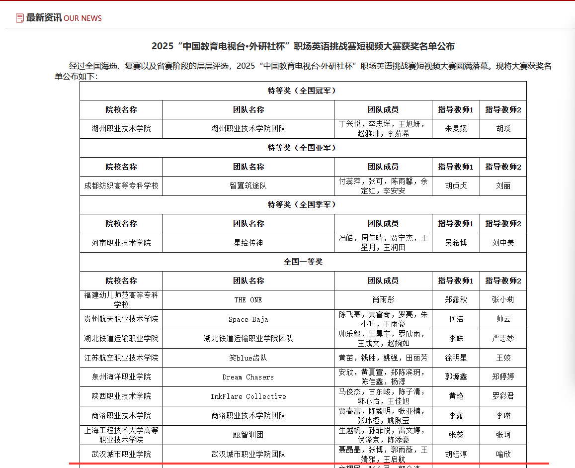 在 2025“中国教育电视台・外研社杯” 职场英语挑战赛短视频大赛的全国舞台上,我校团队一路披荆斩棘、奋勇争先,从全国众多优秀队伍中脱颖而出,成功斩获全国一等奖的优异成绩,为校争光!