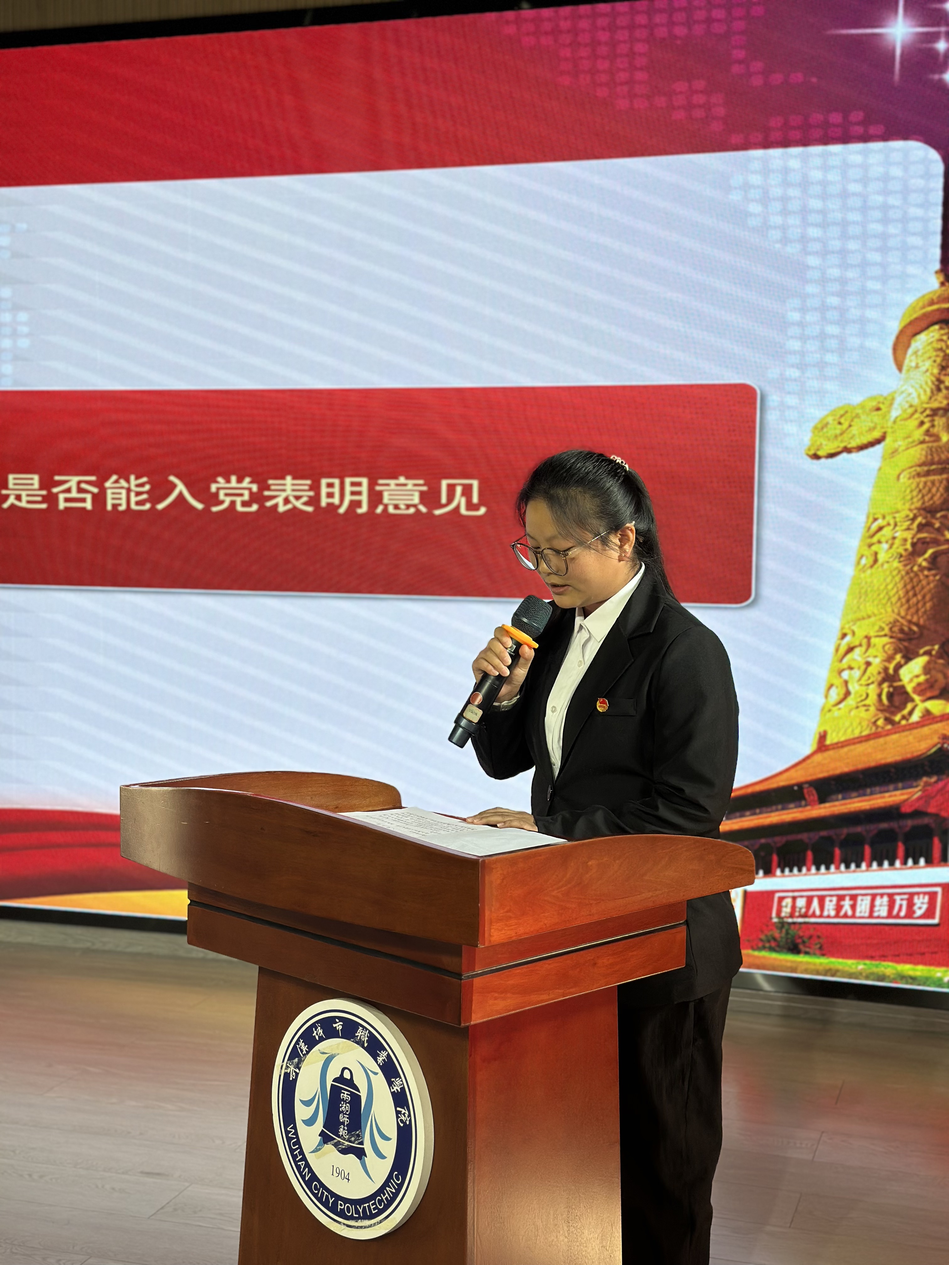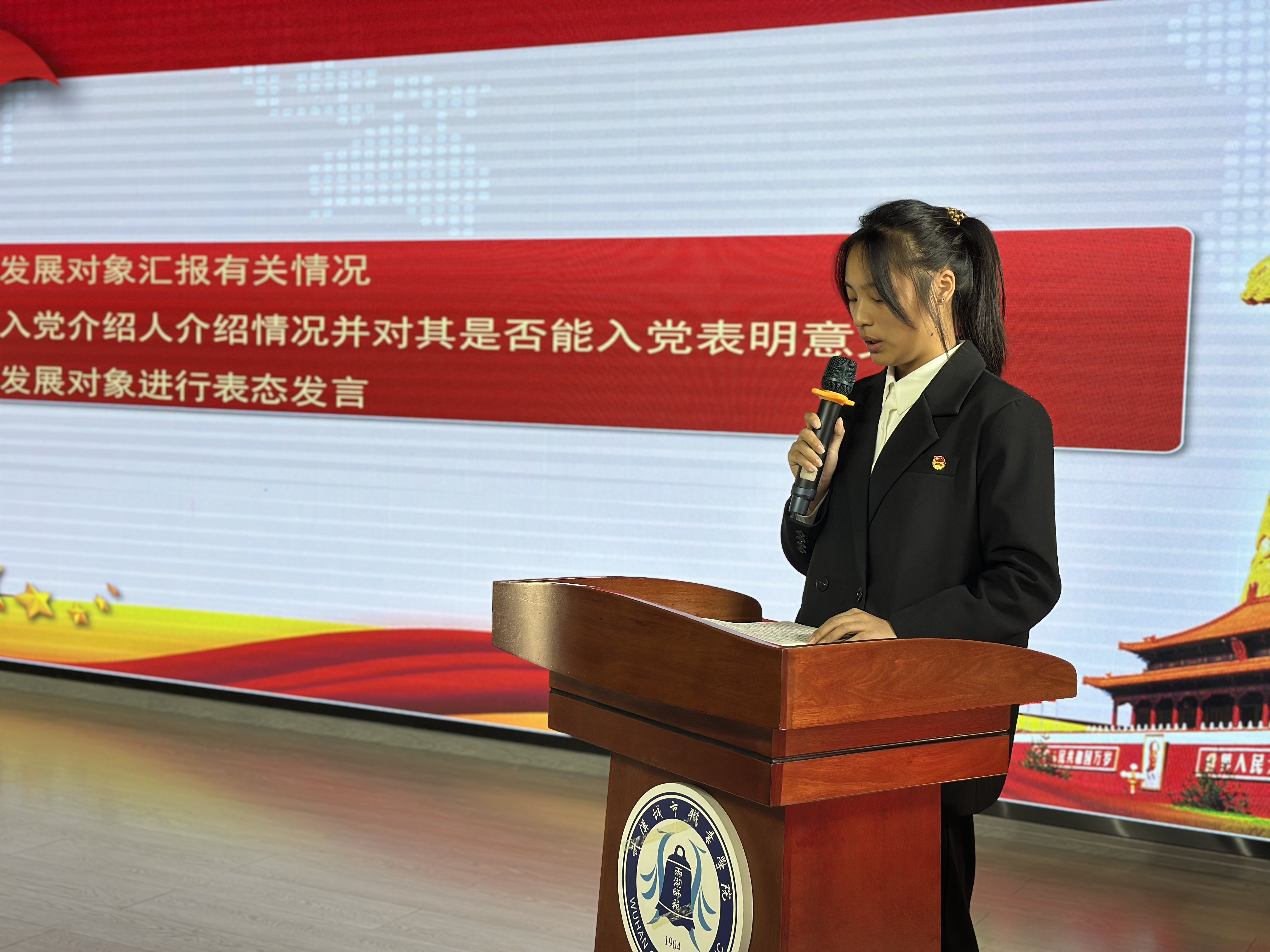 首先,发展对象个人汇报环节。陶麒瑞、王芙蓉、王思雨三位同志依次走向发言席,怀着对党组织的无限崇敬之情,向大会作了全面而深刻的个人汇报。他们结合自身成长经历和学习实践讲述个人入党动机,系统阐述了对党的性质、宗旨和指导思想的理解认识,真诚讲述了在党组织培养教育下思想逐步成熟、信念日益坚定的心路历程,详细汇报了个人履历、家庭情况及主要社会关系,并就需要向党组织说明的事项作了坦诚交代。三位同志的汇报情真意切,充分展现了新时代青年追求政治进步、渴望加入党组织的强烈愿望。