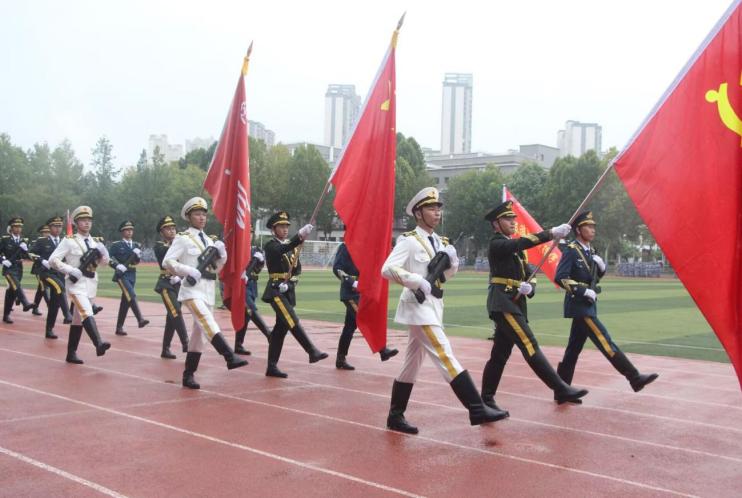 军训会操在庄严的国歌声中拉开帷幕。率先登场的是由新生组成的国旗护卫队,他们身着笔挺的制服,迈着铿锵有力的步伐,精神抖擞地护送旗帜入场。伴随着雄壮的《义勇军进行曲》,五星红旗冉冉升起,迎风飘扬,全体师生肃立注目。