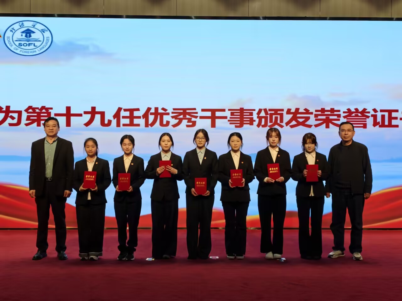 之后,学院党总支书记刘求明老师、副院长张俊老师上台为第十九任优秀干事颁发了荣誉证书。