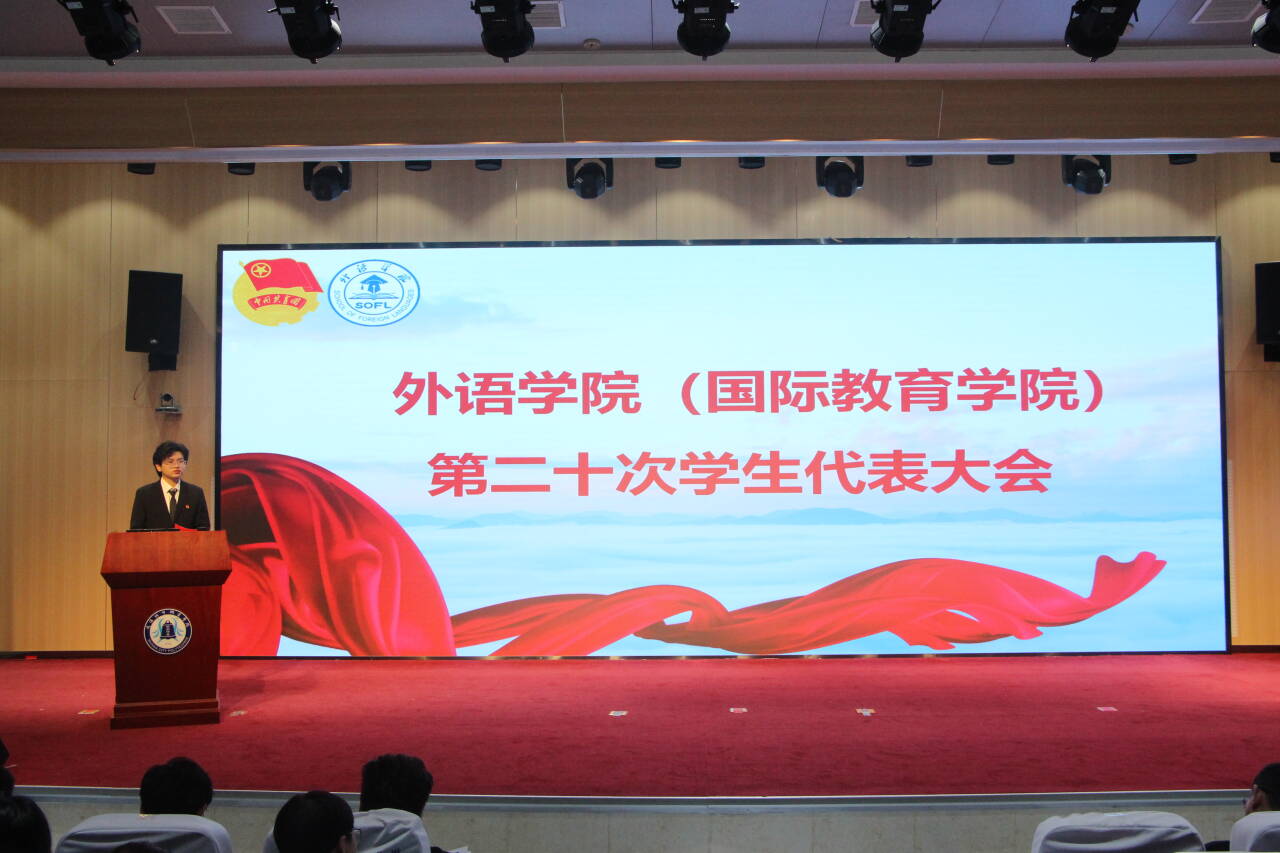 紧接着,在全体参会人员齐唱国歌、团歌后,外语学院(国际教育学院)党总支副书记董云燕老师上台发言。她肯定了过去一年学院在党的建设、人才培养、学科建设、校园文化以及社会实践等事业的进步,感谢学生组织与学生干部的辛勤付出与担当。随后,她对学生骨干提出四点期望:坚定信念把握工作正确方向、恪守服务同学的根本原则、平衡学业与工作做到勤学笃行、广泛倾听意见持续完善自我。最后,她表示学院将继续支持学生会发展,期待新一届学生会带领同学书写学院新篇章。