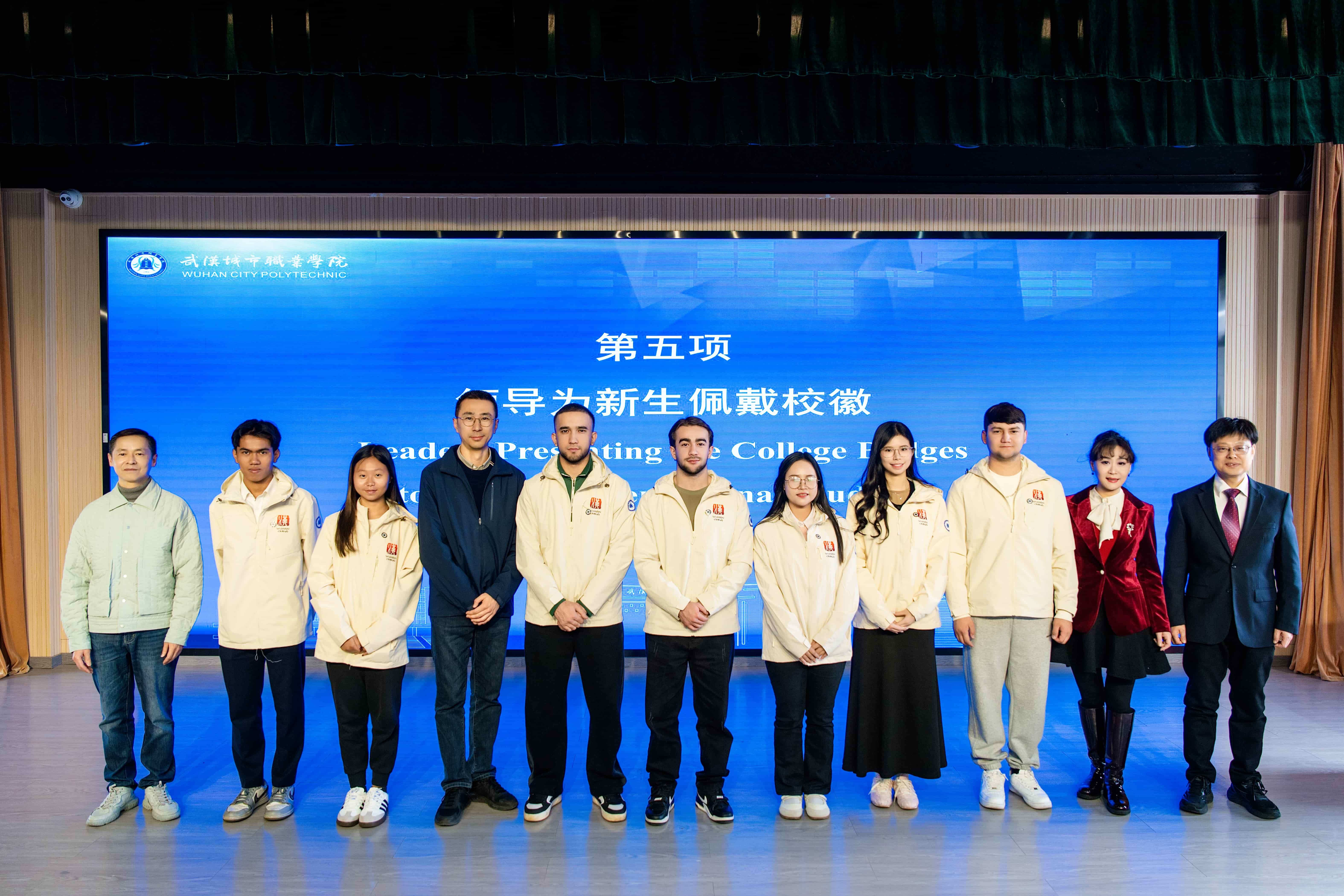 在热烈的掌声中,与会嘉宾逐一为留学生新生佩戴武汉城市职业学院校徽。这一庄严的仪式,标志着16名留学生正式成为“武城人”,他们将在未来的求学时光中,浸润“修为求实、通博致用”的校训精神。
