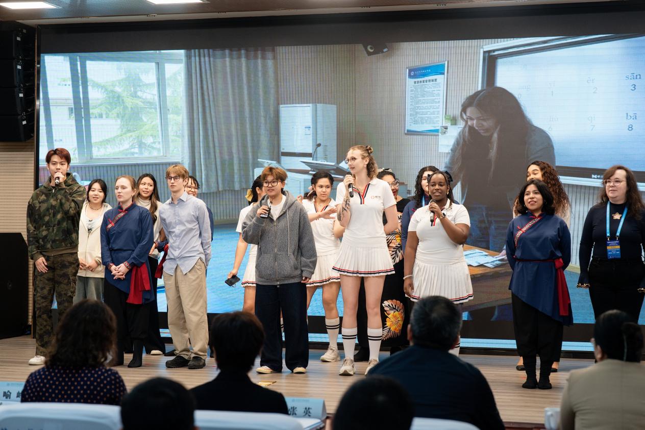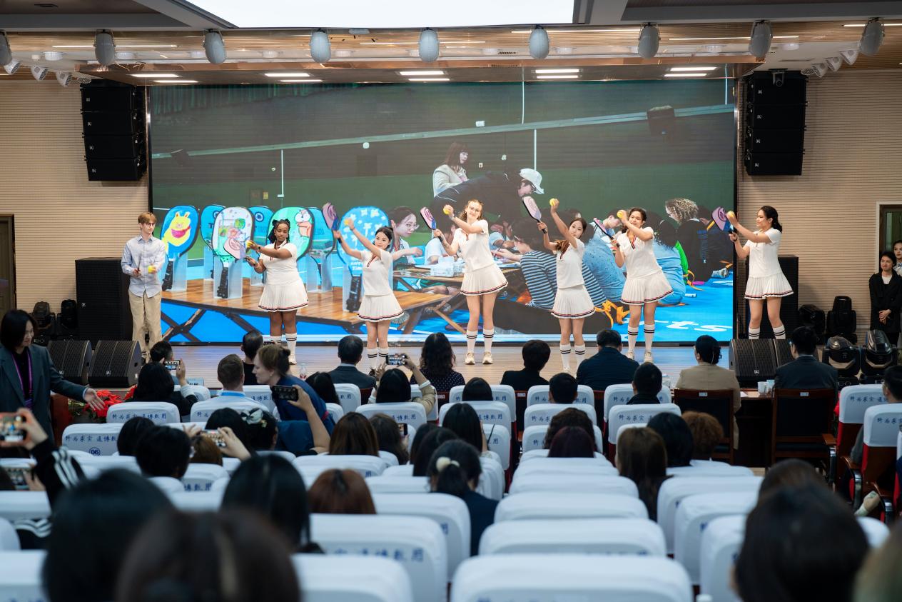 在成果展示环节,中美学生联袂呈现了一场精彩纷呈的汇报演出。活力四射的匹克球操展现了青年学子的蓬勃朝气,中国舞《“欢筷”跃中华》将传统筷子文化与舞蹈艺术巧妙融合,赢得阵阵掌声。最后,中美学生以中英双语共同唱响《盼再与你相见》,用歌声诠释中美友城青年深情厚谊,将现场气氛推向高潮。