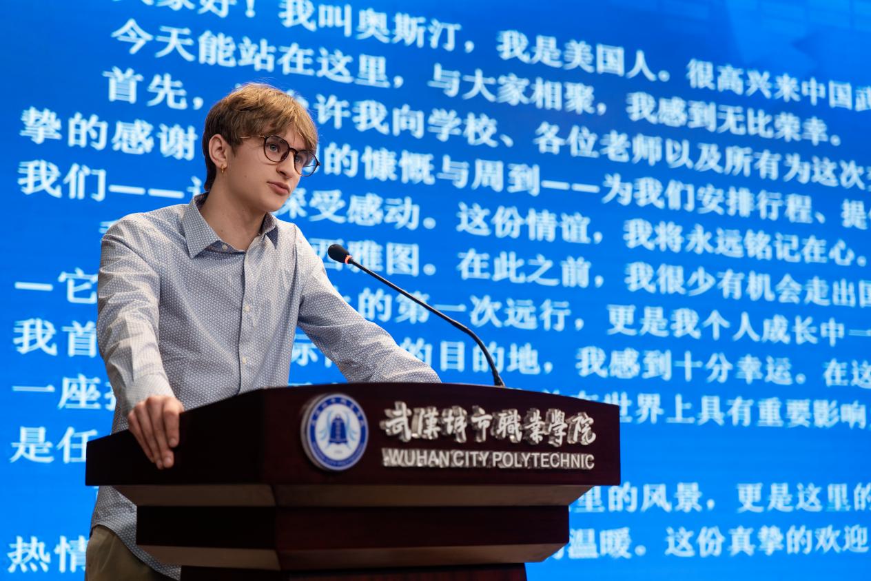 武汉城市职业学院校长刘永生代表学校致辞。他回顾了美国青年学子在汉学习生活的精彩点滴,特别提到:“中美双方师生,用两周不长的时间,做了一件终生难忘的事情。”希望此次研学成为双方友谊延续、合作深化的新起点,共同为中美教育交流和友城青年交流贡献力量。