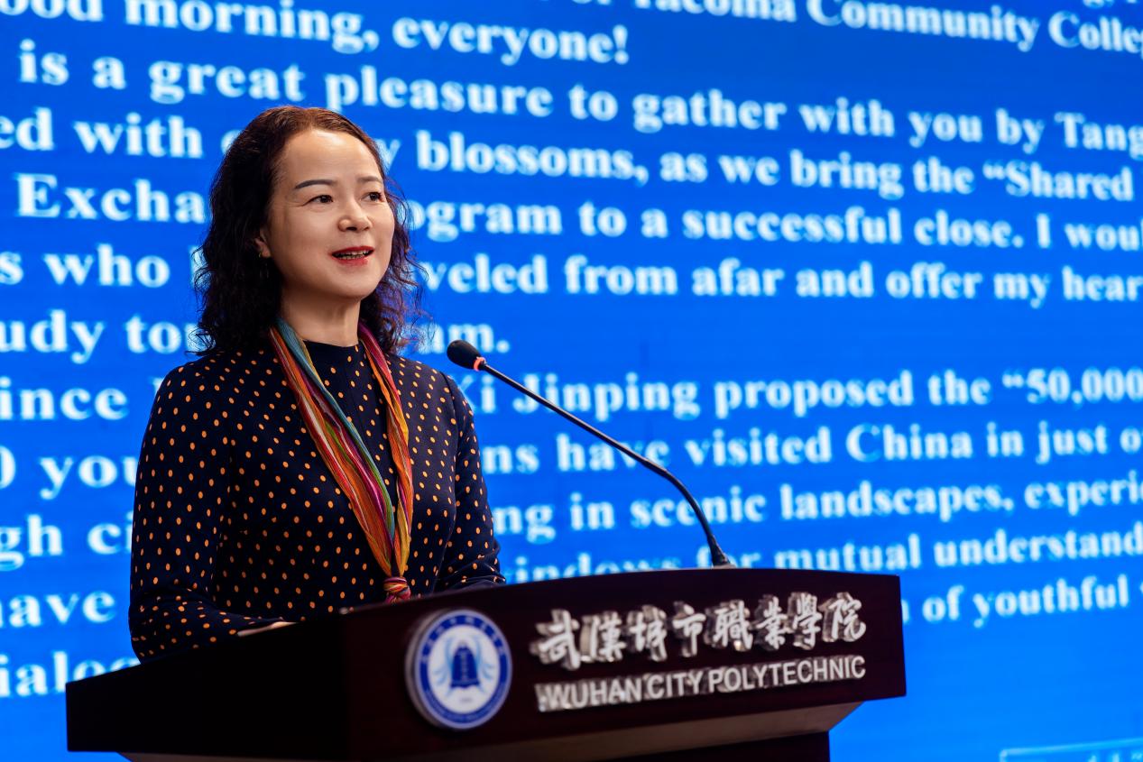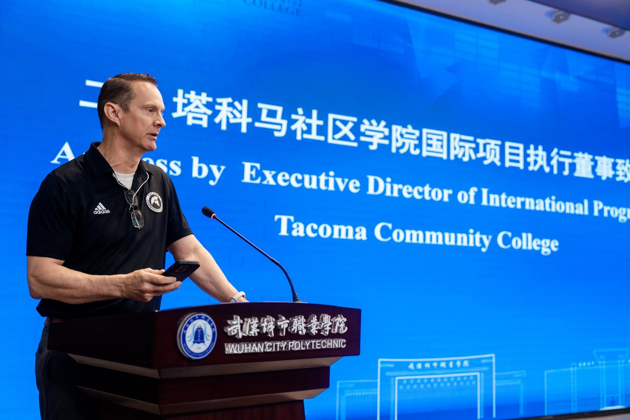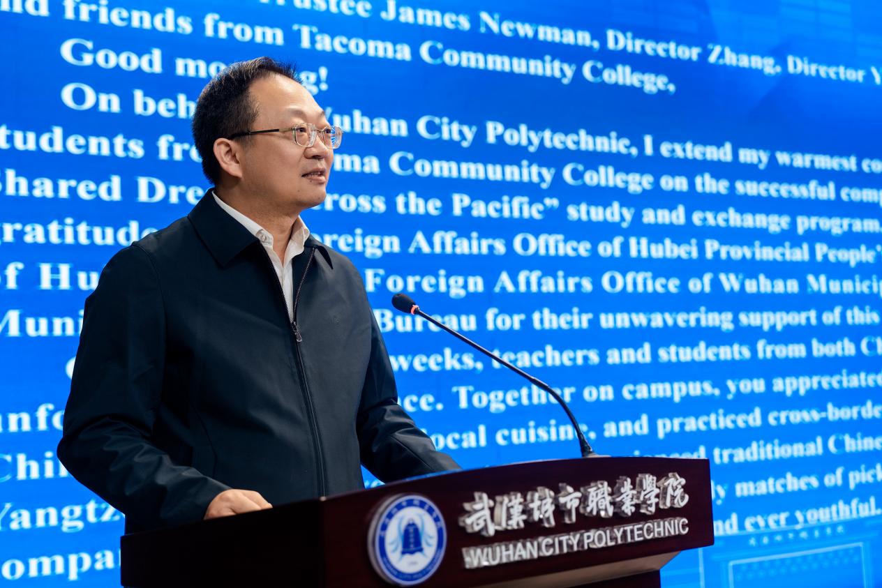 塔科马社区学院董事纽曼先生分别用中、英文致辞,他深情回忆道:“三十年前,我因为一个小项目来到中国,在这里生活了七年。从那以后,我和中国结下了不解之缘。”他表示,正是当年那段经历改变了自己的人生轨迹,因此他特别珍视今天美国青年学子能够来到武汉、走进武汉城市职业学院的机会。纽曼先生对武汉市及学校精心组织的研学活动表示衷心感谢,希望未来两校继续保持密切合作,推动中美青年交流走深走实。