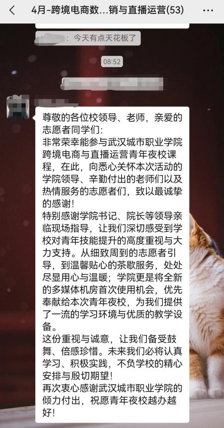 为了更好地服务社会,服务武汉经济发展,在武汉城市职业学院继续教育学院统筹组织下,外语学院(国际教育学院)承办了武汉市青年夜校《跨境电商数字营销与直播运营》课程。该课程是由共青团武汉市委员会主办、武汉城市职业学院承办。2026年4月15日晚,第一期专项学习班在我院顺利开课,一批职场青年利用下班后的业余时间走进课堂,开启“充电蓄能”新模式,为自身职业发展注入新动能。继续教育学院和外语学院主要领导参加了本次活动了本次活动。
